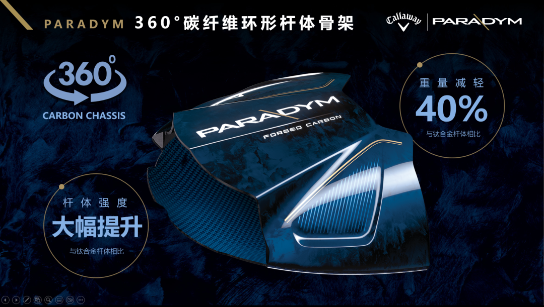 PARADYM发球木行业首创360°锻造碳纤维杆体结构,这块高强度碳纤维部件相较卡拉威传统钛合金杆体减重约44%*。